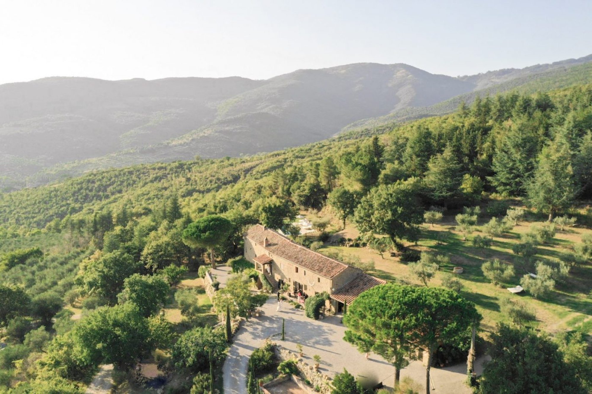 Villa Montanare is a private villa set amid rolling hills, ancient olive groves, and cypress-lined paths in Tuscany. Located near Corona, the magical Tuscan wedding venue Villa Montanare is only an 1 hour 30 minutes from Florence airport. Villa Montanare can host up to 50 guests for a small, yet stylish Italian wedding, sleeps 6 guests in 3 suites and has a beautiful pool overlooking the Tuscan landscape. Surrounded by olive groves, lavender bushes and fruit trees, is the perfect setting for an intimate wedding. With exclusive use available and a dedicated team on hand, this is a venue that rewards couples who value authenticity, privacy, and effortless Italian style.